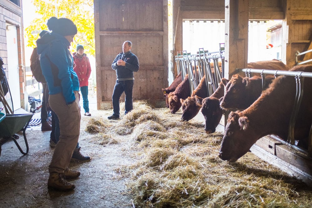 Um die Rinder kümmert sich vor allem Cäsars Frau, Lena. Zu unserer Überraschung erklärt uns Cäsar im grossen Laufstall, dass wir die kräftigen Tiere nicht streicheln sollen: «Das mögen wir ja auch nicht, wenn jemand in den Bus kommt und uns am Kopf anfasst. Den gleichen Respekt sollten wir auch den Tieren zollen.» Im Umgang mit den Tieren versuchen Cäsar und Lena immer, so wenig Stress wie möglich zu provozieren. Sie vertrauen dabei auf einen achtsamen, respektvollen und ruhigen Umgang mit den Tieren, der sogenannten Low-Stress-Stockmanship-Methode (LSS). Diese Methode versuchen sie von der Geburt bis zum letzten Augenblick im Tierleben anzuwenden. Den für die Tiere so schlimmen Transport in ein Schlachthaus haben sie abgeschafft. «Das war eine Riesenbelastung für uns und die Tiere.» Seit nun drei Jahren schlachten sie ihre Rinder selber auf dem Hof. Und dennoch ist damit für beide das Thema Schlachten nicht einfach abgeschlossen. Sie sind sehr offen, darüber zu sprechen und haben auf ihrem Hof auch einen Raum geschaffen, wo Begegnungen für vertiefte Gespräche zu Tierhaltung und Anbau stattfinden können.