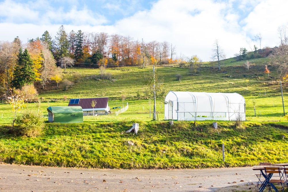 Ein fahrbares Gemüsetunnel rechts, ein mobiler Hühnerstall im Hintergrund und ein Ersatzteil vom «Sau Karawan»: Dies sind integrale Bestandteile eines ausgeklügelten Weidekonzepts und die Manifestation von Cäsars Philosophie: «Alles ist verbunden».