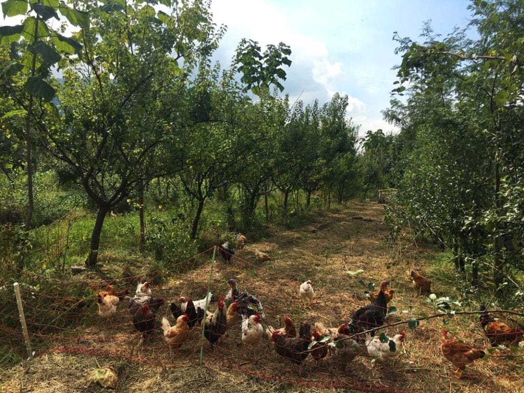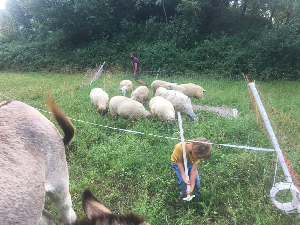 In diesem nächsten Schritt düngen Tiere den Boden und die Pflanzen produzieren Nahrung für Mensch und Tier. Aktuell halten Paola und Matteo bereits einige Schafe, Esel und Hühner. Die Wahl der Tiere ist kein Zufall: Sie ergänzen sich perfekt beim Weiden und nutzen so die artenreichen Wiesen zwischen den Baumreihen. Zuerst grasen die Schafe die proteinreichsten Pflanzen ab, danach kommen die genügsamen Esel auf die Weide und tun sich an Stängeln und zähen Gräsern gütlich und zu guter Letzt räumen die Hühner auf, was übrig geblieben ist. Zurück bleibt ein gut gedüngter Boden, aus dem schon bald wieder saftiges Gras spriessen kann. Um eine Überweidung zu verhindern, grasen die Tiere auf kleinen, eingezäunten Flächen. Paula und Matteo verschieben mehrmals täglich die Zäune. So kann sich das Gras erholen und die Tiere bekommen stets von neuem einen vielfältigen Mix an frischem Futter. In Zukunft könnte dies sogar ohne Zäune gelingen: Bereits gibt es Halsbänder, die über eine App gesteuert den Tieren mit Tonsignalen die Grenze der Weide anzeigen. Doch noch sei diese Technologie zu ungenau für sein kleinräumiges System, sagt mir Matteo.