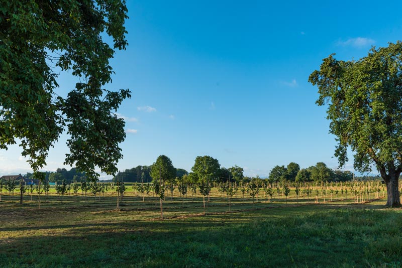 Phuu einiges … Wir haben 1’600 Haselnussbäume auf 2.5 Hektaren gepflanzt und daneben einen Sortengarten mit 53 verschiedenen Sorten angelegt. Mithilfe des Haselnusssortengartens möchten wir in Erfahrung bringen, welche Sorten für unser Schweizer Klima am besten geeignet und am ertragreichsten sind (→ Blogbeitrag zur Blüte & Bestäubung der Hasel). Diese Erkenntnisse werden es in Zukunft erlauben, interessierten Landwirt*innen Sortenempfehlungen für den Haselnussanbau in der Schweiz abgeben zu können. Obwohl die Haselnuss in der Schweiz heimisch ist, gibt es fast keine lokalen Haselnüsse: Das Wissen zur Sortenwahl und erfolgreichem Anbau ist kaum vorhanden und es ist schwierig, an gutes Pflanzmaterial zu kommen.