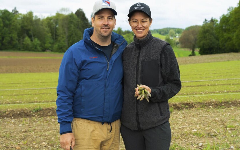 Patrick und Sara Guarisco haben ihren Hof in Wilen bei Neunforn von Saras Eltern übernommen. Sie betreiben auf den 15 Hektaren vom Bio-Hofwerk eine vielfältige, innovative Landwirtschaft: Neben den Spargeln wachsen dort auch Beeren, Kürbisse, alte Getreidesorten und pilzresistente Trauben der Sorte «Souvignier Gris». Saras Bruder und ihr Vater unterstützen die beiden bei der vielen Arbeit, die auf dem Hof anfällt. Dazu gehören auch das tägliche Ernten und Rüsten der Spargeln während der Saison. Ein besonderes Anliegen ist ihnen die Produktentwicklung: Sie tüfteln an neuen Rezepturen und optimieren ihre Produkte laufend. Ihr erklärtes Ziel ist es, unabhängig von grossen Abnehmern zu bleiben und in direktem Austausch mit ihren Kundinnen zu stehen.