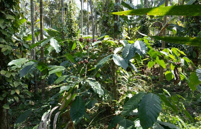 Die kleinen Bauernhöfe der Mitglieder der «Fair Trade Alliance Kerala» sind im Durchschnitt nur gerade zwischen einer und zweieinhalb Hektar gross. Die Bäuerinnen bauen auf dieser kleinen Fläche eine grosse Vielfalt von Produkten an – in mehrstufigen Agroforstsystemen, ganz ohne Pestizide und Kunstdünger. Auf den Betrieben wachsen viele verschiedene Gewürze, Früchte und Gemüsepflanzen, Cashewbäume, Kakao, Kaffee und Kokospalmen. Diese Art der Landwirtschaft fördert die Biodiversität und ist klimafreundlich: Im Boden und in den Bäumen wird viel CO2 gespeichert, auf Hilfsmittel wie Maschinen und Dünger kann fast vollständig verzichtet werden. Zudem haben sich im feuchten Hochland von Wayanad einige Produzentinnen zusammengeschlossen, um traditionelle Reissorten umweltschonend anzubauen – als Reaktion auf die immer stärker industrialisierte Landwirtschaft. Die Mitglieder der «Fair Trade Alliance Kerala» produzieren für sich selbst und ihre Familien. Was den Eigenbedarf übersteigt, wird auf lokalen Dorfmärkten verkauft oder exportiert. Viele Produzent*innen haben ein Zusatzeinkommen, weil Familienangehörige in der Stadt oder gar im Ausland arbeiten und die Bauernfamilien unterstützen.