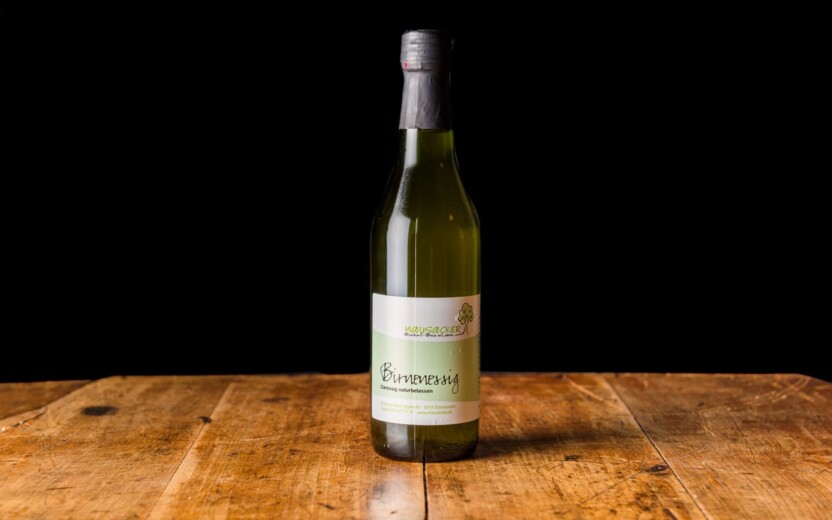 Für diesen naturtrüben Birnenessig werden auf dem Biohof Mausacker alte Mostbirnensorten wie «Gelbmöstler» und «Kugelbirne» verwendet. Die reifen Früchte werden schonend kalt gepresst und naturbelassen gegärt. So entsteht ein ausgewogener Essig mit 7 g Säuregehalt. Der Birnenessig ist etwas feiner im Geschmack als Apfelessig, dennoch mit einer kräftigen Säure.