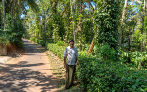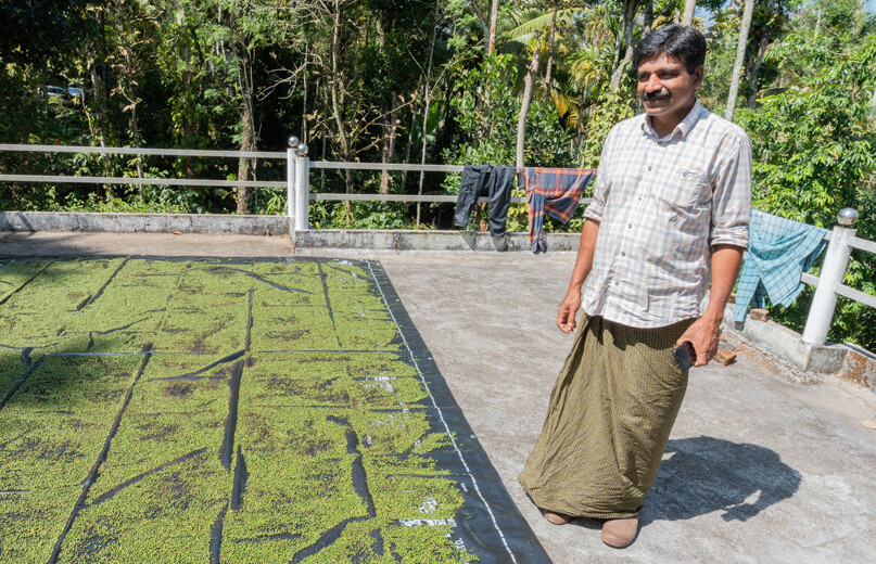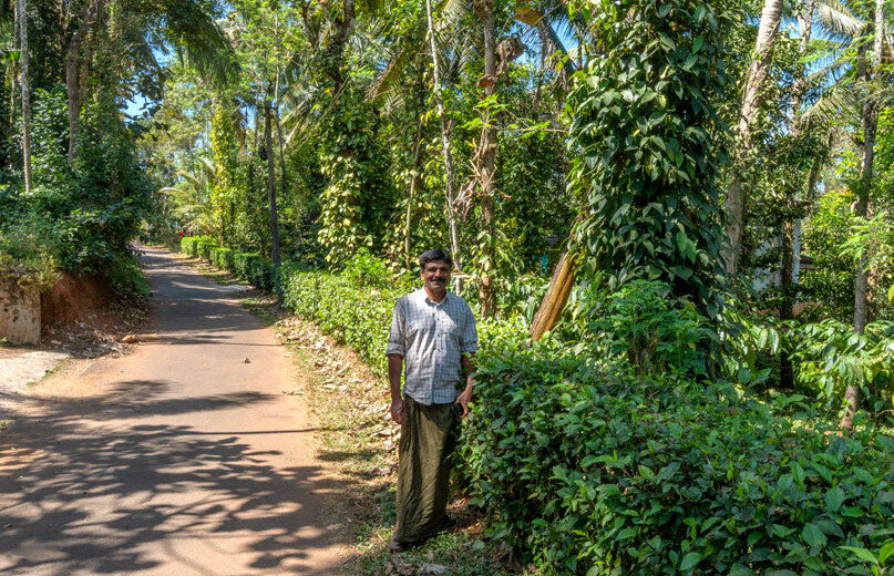 Die kleinen Bauernhöfe der Mitglieder der «Fair Trade Alliance Kerala» sind im Durchschnitt nur gerade zwischen einer und zweieinhalb Hektar gross. Die Bäuerinnen bauen auf dieser kleinen Fläche eine grosse Vielfalt von Produkten an – in mehrstufigen Agroforstsystemen, ganz ohne Pestizide und Kunstdünger. Auf den Betrieben wachsen viele verschiedene Gewürze, Früchte und Gemüsepflanzen, Cashewbäume, Kakao, Kaffee und Kokospalmen. Diese Art der Landwirtschaft fördert die Biodiversität und ist klimafreundlich: Im Boden und in den Bäumen wird viel CO2 gespeichert, auf Hilfsmittel wie Maschinen und Dünger kann fast vollständig verzichtet werden. Zudem haben sich im feuchten Hochland von Wayanad einige Produzentinnen zusammengeschlossen, um traditionelle Reissorten umweltschonend anzubauen – als Reaktion auf die immer stärker industrialisierte Landwirtschaft. Die Mitglieder der «Fair Trade Alliance Kerala» produzieren für sich selbst und ihre Familien. Was den Eigenbedarf übersteigt, wird auf lokalen Dorfmärkten verkauft oder exportiert. Viele Produzent*innen haben ein Zusatzeinkommen, weil Familienangehörige in der Stadt oder gar im Ausland arbeiten und die Bauernfamilien unterstützen.