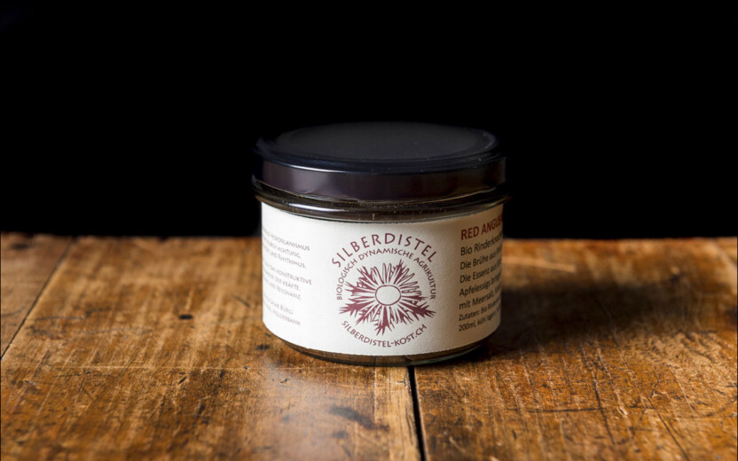 Diese stärkende Knochenbrühe wird auf dem bio-dynamischen Hof Silberdistel im Solothurner Jura aus den angerösteten Knochen der hofeigenen Angus Rinder, etwas Apfelessig und Gewürzen hergestellt. Sie verkörpert die Philosophie von Lena und Cäsar Bürgi, das ganze Tier zu verwerten und Kreisläufe auf ihrem Hof konsequent zu schliessen.