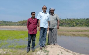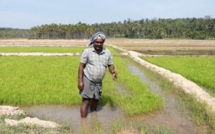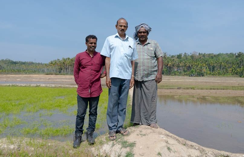 Die kleinen Bauernhöfe der Mitglieder der «Fair Trade Alliance Kerala» sind im Durchschnitt nur gerade zwischen einer und zweieinhalb Hektar gross. Die Bäuerinnen bauen auf dieser kleinen Fläche eine grosse Vielfalt von Produkten an – in mehrstufigen Agroforstsystemen, ganz ohne Pestizide und Kunstdünger. Auf den Betrieben wachsen viele verschiedene Gewürze, Früchte und Gemüsepflanzen, Cashewbäume, Kakao, Kaffee und Kokospalmen. Diese Art der Landwirtschaft fördert die Biodiversität und ist klimafreundlich: Im Boden und in den Bäumen wird viel CO2 gespeichert, auf Hilfsmittel wie Maschinen und Dünger kann fast vollständig verzichtet werden. Zudem haben sich im feuchten Hochland von Wayanad einige Produzentinnen zusammengeschlossen, um traditionelle Reissorten umweltschonend anzubauen – als Reaktion auf die immer stärker industrialisierte Landwirtschaft. Die Mitglieder der «Fair Trade Alliance Kerala» produzieren für sich selbst und ihre Familien. Was den Eigenbedarf übersteigt, wird auf lokalen Dorfmärkten verkauft oder exportiert. Viele Produzent*innen haben ein Zusatzeinkommen, weil Familienangehörige in der Stadt oder gar im Ausland arbeiten und die Bauernfamilien unterstützen.