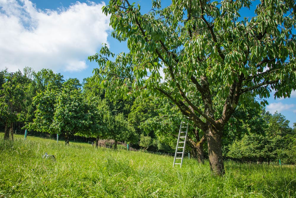 Auf den Streuwiesen um den Riedackerhof stehen alte und jüngere Hochstammkirschbäume der Sorten «Fricktaler Langstiler» sowie Heidegger und Hedelfinger.