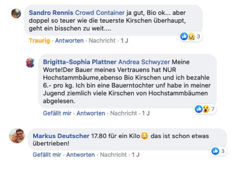 So viel vorneweg: Das einleitende Zitat konnten wir ganz einfach widerlegen – 500 Gramm Bio-Niederstammkirschen im Coop kosteten dieses Jahr 9.95 Franken (also 19.90.–/kg). Über Crowd Container sind Christophs Bio-Hochstammkirschen 1.60 Franken pro Kilogramm günstiger. Ausserdem erhält Christoph für seine Kirschen rund zwei Franken mehr als den empfohlenen Produzentenpreis für Bio-Niederstammkirschen. Der Fakt, dass in einer Niederstammanlage rund 4–5 mal so viele Kirschen pro Stunde geerntet werden können (siehe Film), lässt die Niederstammanlage zwar auf den ersten Blick ökonomischer erscheinen. Allerdings sind die Investitionen und das unternehmerische Risiko einer solchen Niederstammanlage nicht zu unterschätzen.