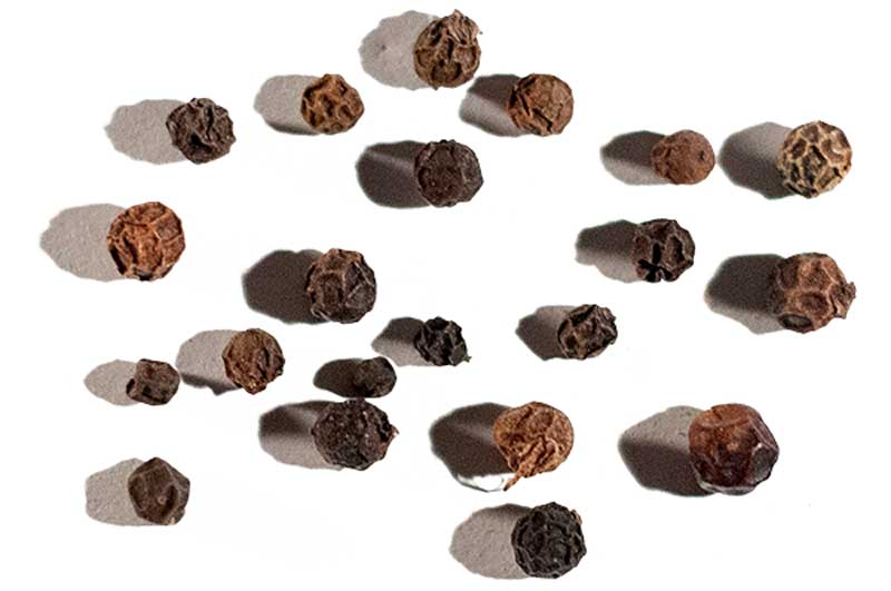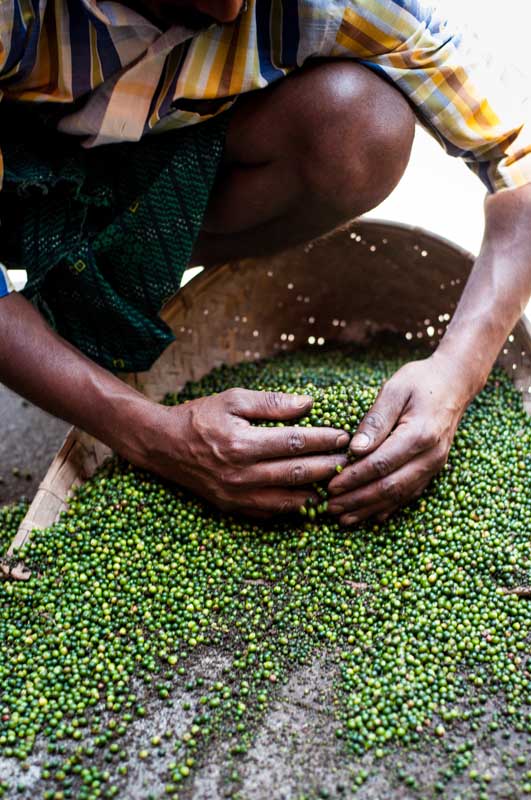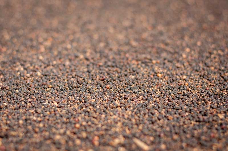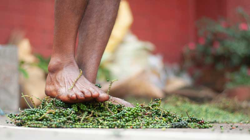 Harvesting season for the ripe drupes of the P. Nigrum plant begin in approximately December and end in March. At this time NJ Thomas and Tangama hire labourers to come and collect the fruits with them.We then head to a nearby home stay named Enteeveedu. Here we meet the owner and learn that she also has her own cultivation of Black pepper that has just freshly been harvested and ready for processing. Over the next few days of our stay here, we get to observe the the de stemming and drying process up close.First the peppercorns are separated from the stems by rubbing them between the two feet, whilst supporting oneself with a ladder or wall. Apparently someone decided it was easier and faser to do so than with the hands… reminiscent of an Italian pressing grapes with his/her feet.The labourers start the next day early by spreading the peppercorns out over a large concrete surface to slowly bake in the hot sub tropical sun. They chater amongst themselves as they work, the energy is calm and concentrated.In the evening to protect the peppercorns from being damaged by moisture, they are collected again by hand and stored in jute bags overnight. The process of spreading out over the concrete and collecting again is repeated the following day. After the second day the peppercorns colour has changed to the desired dark brown to black. They are then collected, stored, sold or sent away for further processing.Are you interested in testing out the difference between a Malabar Pepper mix and a single origin karimunda pepper? For a very limited time you can order yours here at the Crowd Container.