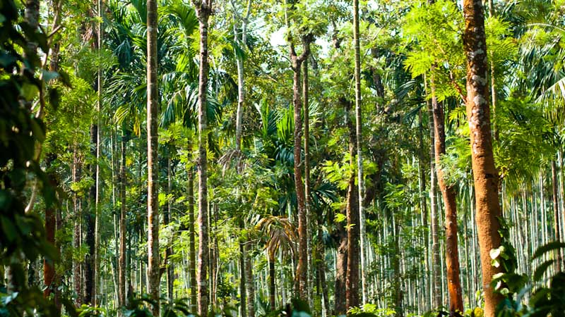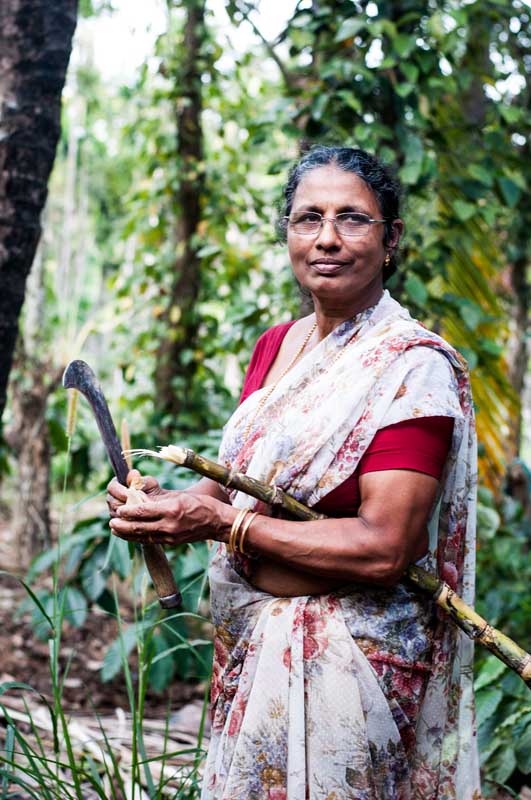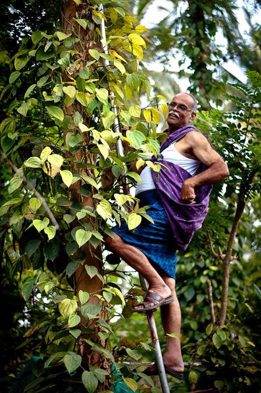 Taking a taxi from Kozhikode, we wound our way up narrow roads through subtropical broadleafed forests. Grey Langur monkies crossed the newly built roads as Bollywood music played quitely in the airconditioned car. We were on our way to Wayanad, in India’s Southern state of Kerala. Or more specifically Nadavayal, the home of Pepper farmer NJ Thomas. Who along with his wife Tangama are members of the Fair Trade Alliance Kerala.Touring through NJ Thomas’s Garden, he explains to us how the age old tradition of Homestead Gardening works. Firstly they produce for themselves and their family and the surplus is then traded through the Fair Trade Alliance Kerala. This means that their interest lies not on the production of 1 or 2 cash crops but rather an entire array of different foods and spices, therby protecting biodiversity and shutting out the concept of Monoculture.The pepper plant piper nigrum is a perennial woody vine growing up to 4m in height on supporting trees. A single stem bears appoximately 20-30 fruting spikes. In total NJ Explains that he is cultivating 15 different varieties of Pepper on his small farm. These will all be mixed together and collectively named ‚Malabar Black Pepper‘.